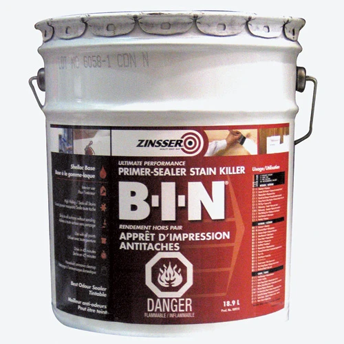 Apprêt d’impression antitaches pour l’intérieur B-I-N de Zinsser. À base de gomme-laque, cette formule possède un grand pouvoir cachant et adhère à toutes les surfaces sans ponçage. S’utilise avec toutes les peintures. Séchage ultrarapide avec recouvrement en 30 minutes. Élimine les taches et scelle les noeuds. Meilleur anti-odeurs, peut être teint. Couleur : blanc. Format de 18,9 L. Apprêt-scelleur à base de gomme-laqueLe meilleur scellant pour les tachesScelle les n?uds et les traces de sèveÉtanche les odeurs d’animaux, de fumée et de moisiAdhère à toutes les surfaces sans ponçageRevêtement à séchage rapide comme l’éclair en 45 minutesLe meilleur scellant pour le bois neuf, les panneaux muraux, le plâtre durci et toutes les surfaces poreuses