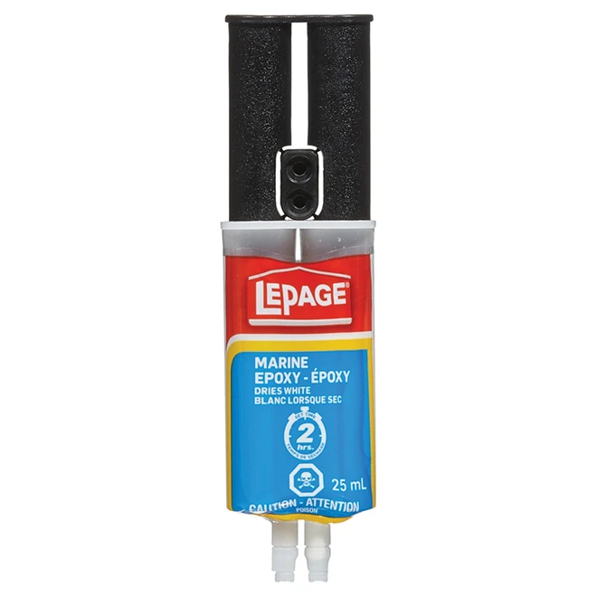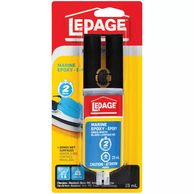 La colle époxyde « Marine » en seringue de Lepage est un système en deux parties qui consiste en une résine époxyde et un durcisseur. Elle colle au métal, verre, fibre de verre, à la céramique, au bois et à certains plastiques rigides et est utilisée pour des surfaces exposées à l’immersion dans l’eau telles que le PVC, le cuivre, le laiton et les tuyaux galvanisés. Par conséquent elle peut être appliquée et sèchera sous l’eau. Elle est appliquée en 10 minutes, sèche en un fini gris et quand elle est sèche, elle peut être sablée et percée. Elle vient dans une seringue pratique qui dispense des quantités égales des deux composants. L’excès de colle peut être immédiatement nettoyée avec de l’acétone avant que l’adhésif ne sèche. Quant à l’adhésif sec, il peut être enlevé avec précaution au moyen d’un outil tranchant. Elle vient dans un format de 25 ml. Colle les surfaces humides : l’époxy permanent peut être appliqué et durci sous l’eau et est idéal pour les projets nécessitant une force d’adhérence élevée sur des surfaces exposées à l’immersion dans l’eauApplicateur à deux seringues : distribue commodément la résine et le durcisseur en deux parties, en quantités égales, pour produire un lien solide, rigide et très résistantRapide et simple : la formule unique prend en 2 heures seulement et durcit complètement en 24 heuresImperméable et résilient : ne rétrécit pas et est très résistant à l’eau, aux solvants et aux chocs importants, et peut être facilement poncé ou usiné