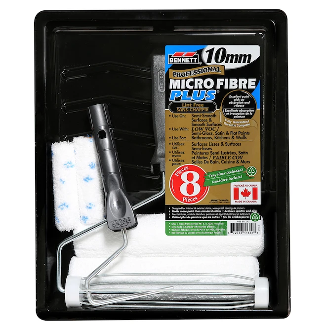 Optez pour la trousse de peinture de Bennet afin d’obtenir des résultats satisfaisants quand vous peinturez la cuisine, la salle de bain et les murs. Elle contient 2 mini-rouleaux, 2 manchons, 2 montures de rouleau, 2 rouleaux à découper et une doublure en plastique. La microfibre de ces manchons ne retient pas la poussière. Ils sont donc parfaits pour les peintures brillantes et empêchent la peinture de dégoutter. Le tissu Microfibre Plus, très absorbant, répartit uniformément la peinture et, grâce à lui, vous obtenez un fini lisse. Sans charpie.Fabriqué au Canada