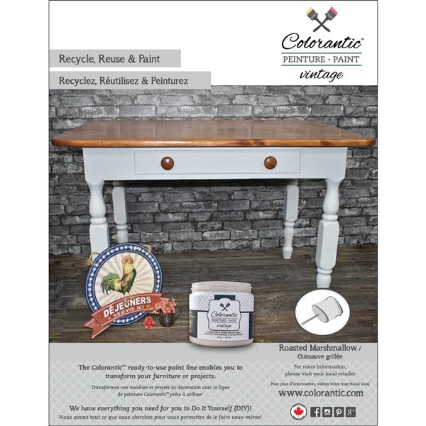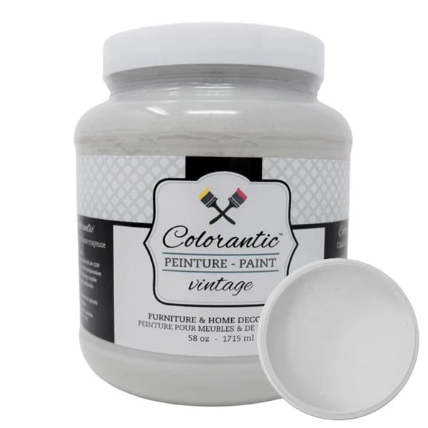 La peinture à la craie de Colorantic au fini mat crayeux est non-toxique et ne contient pas de plomb. Les colorants ajoutés ne contiennent qu’une infime quantité de composés organiques volatils (COV), répondant en tous points aux normes gouvernementales de Santé Canada. Les peintures à la craie Colorantic™ sont aussi écologiques.Peinture à base d’eauContenant en plastique recyclable avec un couvercle blanc refermable pour la longévité du produitFabriquée au CanadaSèche en peu de temps, 30 minutes après l’applicationAdhère sur la plupart des surfaces telles que le bois, le tissu, le métal mat, avec peu de préparationRincer la surface avec un linge humide avant d’appliquer la première couche de peinture