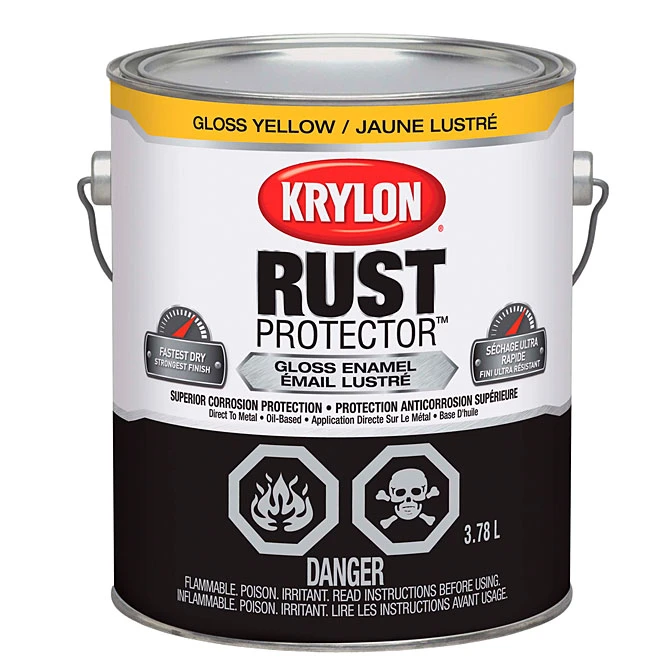 La peinture-émail Rust Protector(MC) de Krylon(MD) à appliquer au pinceau s’applique directement sur le métal pour le protéger contre la corrosion. Un temps de séchage plus court assure un fini de qualité. Le fini est lisse et durable. Protection anticorrosion supérieure, avec ou sans apprêt. Sec au toucher en 60-90 minutes. Manipulation en 3 à 4 heures. Ce produit peut être appliqué sur le bois, le métal, l’osier, le verre, le plâtre, la céramique, le béton et la maçonnerie. Peinture de couleur jaune au fini lustré. Contenant de 3,78 l. Protection supérieure contre la corrosion – avec ou sans apprêtSèche en 60-90 minutesÀ base d’huileFinition lisse, durable et résistante à la rouille