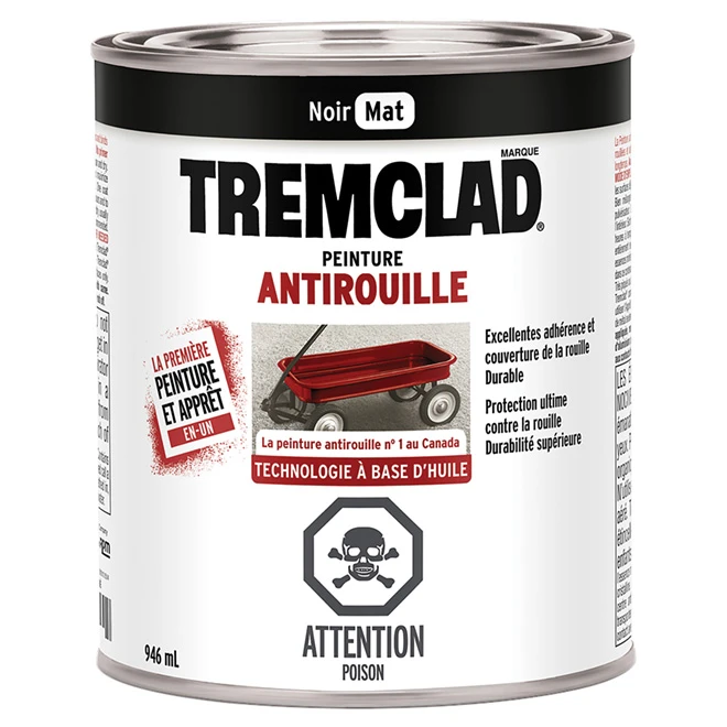 La peinture antirouille Tremclad(MD) à base d’huile offre une protection supérieure contre la rouille et est spécialement formulée pour pénétrer la rouille et adhérer au métal. Pour surfaces métalliques neuves ou rouillées. Ce produit peut être appliqué directement sur le métal et un apprêt n’est pas requis pour la plupart des applications. Peinture de couleur noire. Fini mat. 946 ml La peinture antirouille Tremclad offre une inhibition supérieure de la rouille et est spécialement formulée pour pénétrer la rouille et se lier au métalExcellente couverture de la rouille, s’applique directement sur le métal et l’apprêt n’est pas nécessaire pour la plupart des applications
