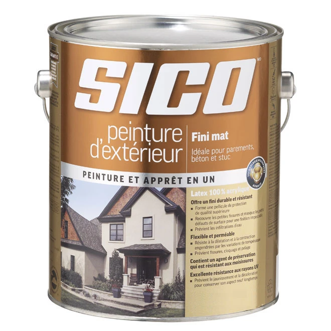 Latex acrylique d’extérieur. 3,5 L. 100 % acrylique. Fini mat. Super durable. Résiste aux intempéries et à la moisissure. Base jaune. Choix de couleurs. Peinture et apprêt 100% acrylique en un seul produitOffre des propriétés de construction élevéesSouplesse et respirabilité exceptionnellesContient un conservateur qui résiste à la moisissure