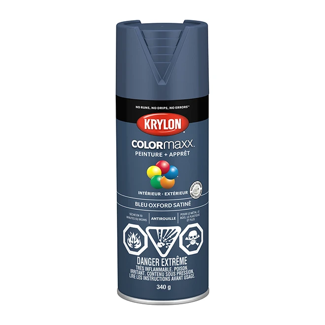Le mélange de peinture et apprêt Krylon Colormaxx propose des couleurs vives et brillantes et convient à des surfaces en tous genres. Son application laisse une finition homogène sur la surface tout en protégeant celle-ci contre la rouille. L’embout de pulvérisation est équipé d’un grand bouton pressoir qui facilite l’application. Le design de cette formule en aérosol vous offre la possibilité de pulvériser à n’importe quel angle pour une couverture rapide. Qu’il s’agisse d’un usage à l’intérieur ou à l’extérieur, les peintures de la gamme Colormaxx sèchent en 10 minutes ou moins et sont toutes indiquées pour le bois, le métal, l’osier, le plastique, la céramique et le verre. Fini couleur bleu Oxford. Couverture de première qualité et couleur supérieure avec une excellente adhérence et durabilitéUtilisation intérieure/extérieure avec protection contre la rouilleSèche en 10 minutes ou moinsBuse de pulvérisation à gros bouton avec capacités de pulvérisation à volonté