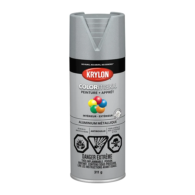 Le mélange de peinture et apprêt Krylon Colormaxx propose des couleurs vives et brillantes et convient à des surfaces en tous genres. Son application laisse une finition homogène sur la surface tout en protégeant celle-ci contre la rouille. L’embout de pulvérisation est équipé d’un grand bouton pressoir qui facilite l’application. Le design de cette formule en aérosol vous offre la possibilité de pulvériser à n’importe quel angle pour une couverture rapide. Qu’il s’agisse d’un usage à l’intérieur ou à l’extérieur, les peintures de la gamme Colormaxx sèchent en 10 minutes ou moins et sont toutes indiquées pour le bois, le métal, l’osier, le plastique, la céramique et le verre. Fini de couleur aluminium. COLORmaxx offre une excellente adhérence et durabilité, ainsi qu’une peinture et un apprêt en un seul produitOffre une protection contre la rouille, une résistance à la décoloration et aide à préserver tous les projets à l’intérieur et à l’extérieurIdéal pour le métal, le bois, la plupart des plastiques, l’osier, le tissu, le verre, etcSèche en 10 minutes ou moins et couvre jusqu’à 25 pieds carrés