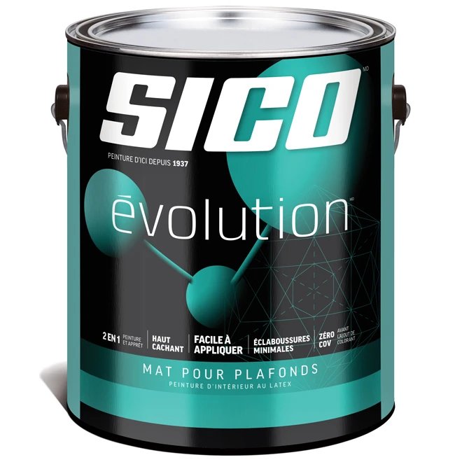 Peinture et apprêt d’intérieur 2-en-1 à haut pouvoir cachant SICO Evolution. Il s’agit d’un produit spécifiquement conçu pour une application sur les plafonds intérieurs dans les endroits résidentiels et commerciaux. Cette peinture au fini mat diffuse parfaitement la lumière ambiante tout en vous permettant de camoufler certaines imperfections. Facile d’application et sèche rapidement en n’émettant aucun COV et une faible odeur. Peinture blanche prête à l’emploi ou pouvant être teintée pour obtenir des tons pastel (max 3 oz/3,78 L). Contenant de 3,78 L. Facile à appliquerBon pouvoir couvrantPeinture et apprêt tout-en-unZéro VOC.Éclaboussures minimales grâce à l’émulsion de polymère à haute viscositéRetouches faciles