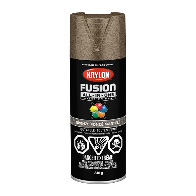 La formule tout-en-un en aérosol Krylon Fusion est une peinture et apprêt adhérant aux surfaces difficiles telles que les plastiques. Son application ne nécessite ni ponçage, ni apprêt préalable. Conçue aussi bien pour l’intérieur que pour l’extérieur, elle propose une finition bronze foncé procurant un aspect martelé aux surfaces tout en les protégeant efficacement contre la rouille. La gamme de peintures de qualité supérieure Krylon offre une résistance ultime et une adhérence inégalée. Excellente adhérence et durabilitéAucun ponçage ou apprêt n’est nécessaireBuse de pulvérisation à gros bouton avec capacités de pulvérisation à volonté