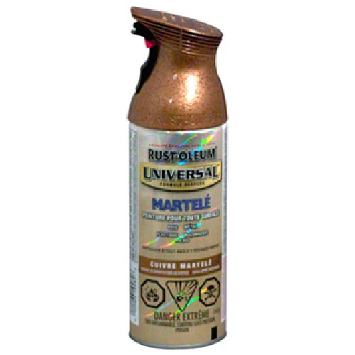 Peinture en aérosol pour toutes surfaces. La nouvelle gachette ergonomique combinée avec un angle de vaporisation de 360 degrés crée une expérience vraiment unique. Peinture toute surface : bois, plastique, métal, béton, verre, vinyle et plus. La conception ergonomique élimine le malaise du doigt. Système de vaporisation avancée pour couverture complète et rapide. Cuivre martelé. Rust-Oleum Universal Hammered Spray Paint est une peinture et un apprêt en un seul produit qui offre une couverture et une durabilité supérieures sur toute surfaceAntirouille,Protection durablePour usage intérieur et extérieurVaporisateur tout angle avec embout confort