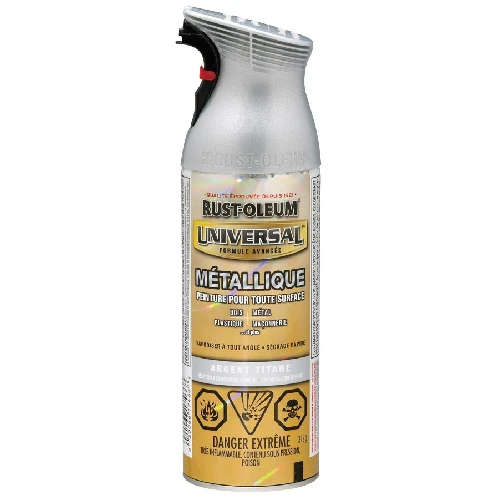 Peinture en aérosol pour toutes surfaces. La nouvelle gachette ergonomique combinée avec un angle de vaporisation de 360 degrés crée une expérience vraiment unique. Peinture toute surface : bois, plastique, métal, béton, verre, vinyle et plus. La conception ergonomique élimine le malaise du doigt. Système de vaporisation avancée pour couverture complète et rapide. Argent titane. Une formule antirouille pour l’intérieur et l’extérieur à utiliser sur le bois, le vinyle, la fibre de verre, le plastique, le béton, le métal, le verre, l’osier et plus encorePoignée de pulvérisation ergonomique à 360 degrés qui ne laisse pas de gouttes et qui offre une plus grande couverture que les peintures en spray classiques