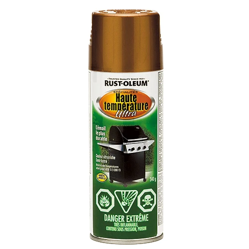 Peinture en aérosol à émail haute température. Fini satiné qui résiste jusqu’à 1200°F. Idéal sur les barbecues, poêles à bois, radiateurs, moteurs et autres items en métal. Protège contre la rouille et la corrosion. Émail antirouille supérieur qui offre la meilleure protection pour les surfaces à haute températureFinition semi-lustrée durable qui embellit les surfaces métalliques et qui leur permet de conserver leur couleurIdéal pour les grilles de barbecue, les poêles à bois, les radiateurs, les foyers, les écrans de cheminée, les pièces automobiles, etcUtilisation à l’intérieur et à l’extérieur