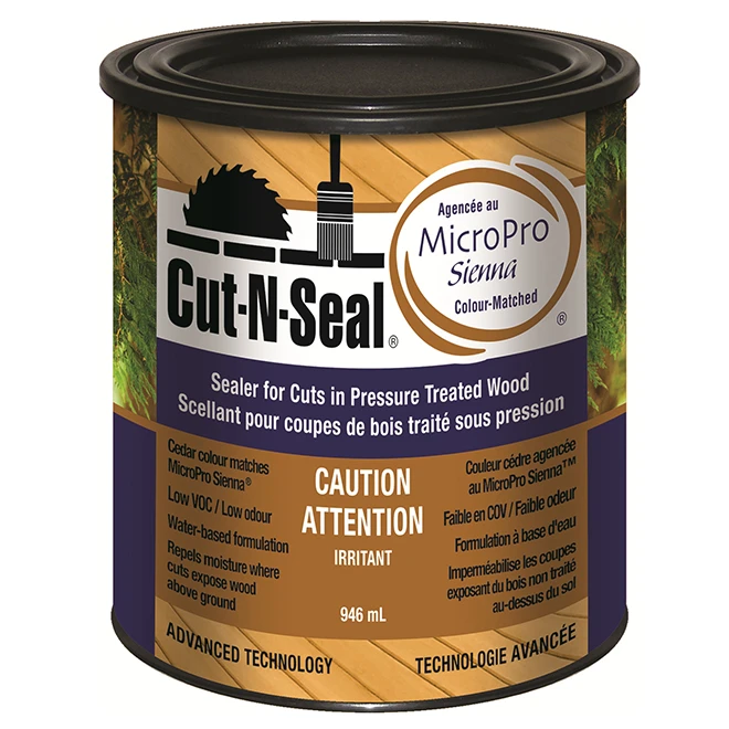 Le scellant Cut-N-Seal scelle et imperméabilise les coupes exposées de bois non traité pour le bois traité sous pression. Sa formule à base d’eau est faible en COV et en odeur. De plus, sa couleur s’accorde avec les coupes et les trous où leur apparence compte, soit la terrasse, les poteaux et les piquets de clôture. Ne pas utiliser sur le bois en contact avec le sol, dans les fondations en bois préservé, pour recouvrir les surfaces de bois traité sous pression ou remplacer le le traitement sous pression. Ce scellant est prêt à utiliser et se nettoie avec du savon et de l’eau. 946 ml. Cut-n-Seal est un produit d’étanchéité et de protection contre l’humidité prêt à l’emploi appliqué au pinceauLa formule à base d’eau a une faible odeur et un faible volume de vapeurLe brun Sienna est une couleur proche de celle des coupes et des trous où l’apparence compte, comme les rampes, les terrasses, les dessus de poteaux et les planches de clôtureNettoyage facile à l’eau savonneuse.Prêt à l’emploi