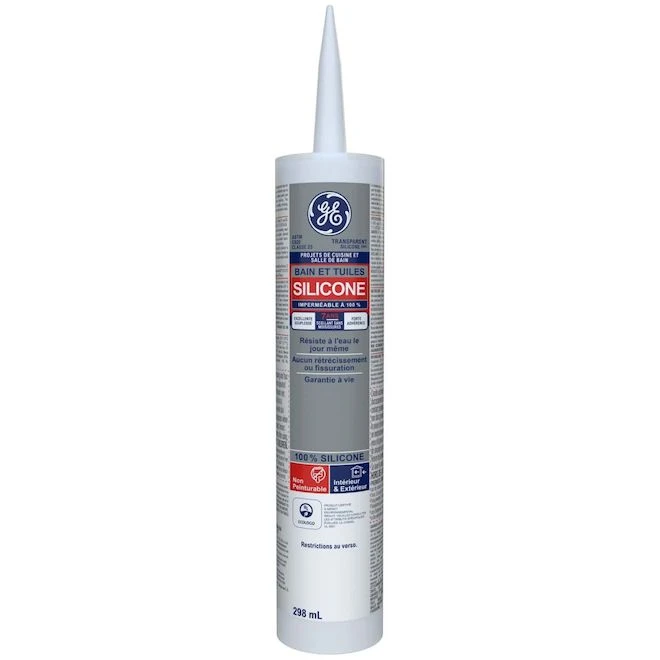 Le scellant silicone pour baignoire et tuiles de GE est 100 % imperméable et idéal pour les projets d’étanchéité de cuisine et de salle de bains où l’humidité peut être présente. Il résiste au développement de moisissures et de mildiou causant des taches disgracieuses et adhère bien aux surfaces les plus courantes de la cuisine et de la salle de bains. Ce produit d’étanchéité de haute qualité reste toujours flexible, ne se fissure pas, ne rétrécit pas, ne se décompose pas et ne disparait pas au lavage. Il peut être prêt à l’emploi le jour même, en plus d’être couvert par une garantie limitée de 7 ans. Résiste à la moisissure avec une protection de 7 ans contre les moisissuresRésiste à l’eau le jour même de l’application100% silicone est imperméable et résistant aux intempériesRésistant au soleil et au gelRépond aux spécifications ASTM C-920 Classe 25Reste toujours flexibleNe se fissure pas, ne rétrécit pas, ne se décompose pas et ne disparaît pas au lavageStabilité en cas de gel/dégelNon peignable