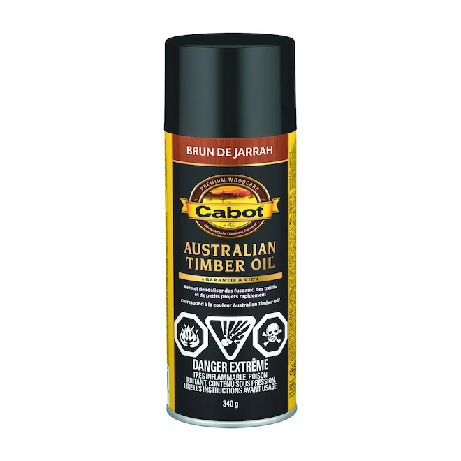 Utilisations recommandées pour terrasses extérieures en bois, parement, clôtures, garde-corps, marches, meubles extérieurs en bois, pour les substrats en bois seulement. Cabot Australian Timber Oil est un mélange unique d’huiles formulées à l’origine pour protéger les bois denses d’Australie, tels que le tallowwood, le cambara et le merbau, contre des expositions extrêmes. Il s’agit d’un traitement à l’huile translucide éprouvé et spécialement formulé pour les terrasses et les meubles extérieurs. Pénètre profondément dans le bois pour accentuer la profondeur et la patine du bois naturel. Contenant un mélange précis d’huile de lin de qualité superbe pour une pénétration maximale, d’alkydes longs en huile pour la durabilité et d’huile de tung (huile de bois de chine) pure pour la profondeur de couleur et l’imperméabilité à l’eau, elle offre une protection à l’huile à triple action. Des pigments d’oxyde ferrique translucides complexes sont ajoutés afin de garantir une surface durable qui absorbe les rayons UV avec des couleurs et des dimensions riches. Cette garantie exclut tout dommage accessoire ou indirect. Protection contre les huiles à trois voies – tung, lin, alkydePour les terrasses, les bardages et les garde-corpsSurface durable absorbant les UV, riche en couleurs et en dimensions.